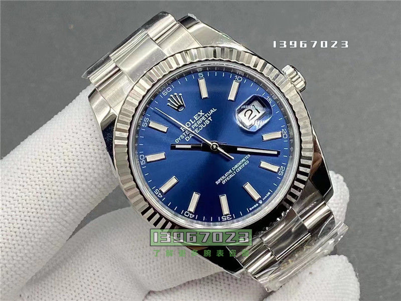 新款盘面中间是有一个白色的小皇冠,这些也是对应的。这个C座的这个日志其实是所有日志里边,第一是小细节处理到位,第二就是它搭载的是一个3235机芯,这边有一个贴纸,3235机芯有一个特点,咱们一起调节时间看一下。逆时针解开这个3点位标靶之后,直接顺时针手动上动力。轻轻拔一下。顺时针调节日历。这个都没问题,再拔出来一下,通过逆时调节事件,这个也是3235机芯一个最大的特点,就是它是通过逆时针调节事件,向里推的同时再向上拧,把它拧紧就好了,它是通过逆时针调节事件,如果你拆开它的后盖之后,你会发现它是一个非常细腻的3235机芯,这是一个自产机芯,然后整体的日历窗口,小表镜,带有蓝光镀膜,这些小细节肯定都是存在的,蓝色的一个放射性的牌面,从中间向死周迸发出这种放射型的视线,那一次的双层暗影刻自该有的都是存在的。狗牙圈的闪耀程度也是非常好的,因为今天是阴天,但是闪耀程度还是不错。表带全部采用的是904精钢,这个也是比其他的表带要好一些,和AR是通厂的,哎呀,做表带各位都知道,一直是一个做表带最好的,然后这个C做的也是一个9042金刚的表带,所以说这个表带的材质是对应的。