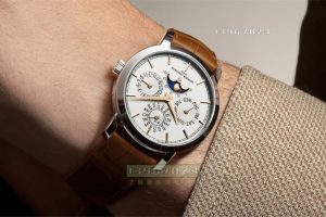 镀铑棒状指针、带有圆形尖端的时针和分针以及带有扫过内部分钟轨道的圆点的秒针也是如此。表冠位于 1:30 位置,为鲜明的设计增添了令人惊讶的元素。
