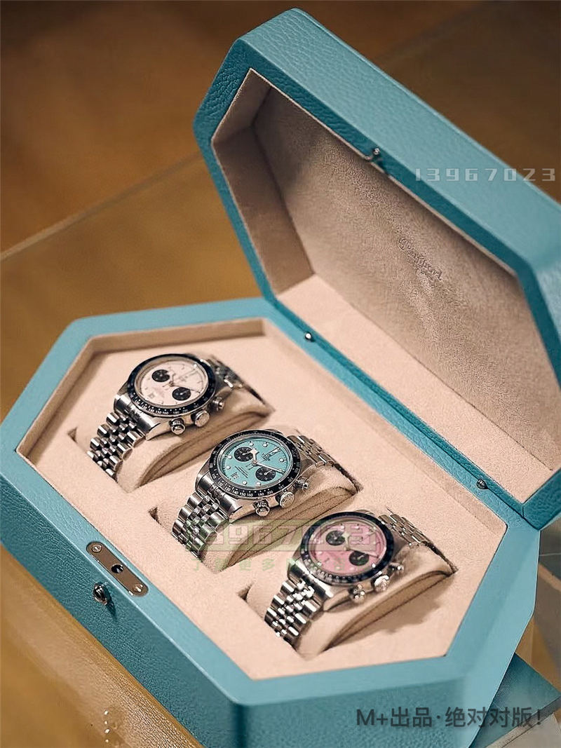 这个火烈鸟的蓝面,包括这个粉面,这两个颜色是最火的。而且现在这两个专柜应该是比较难买到了,所以现在玩一玩这个最高版本,真的非常合适,我个人也是非常推荐的,真的是入手不会后悔的一个款式。如果大家觉得这两个颜色相对比较张扬的话,也可以选择这个熊猫盘。熊猫盘的白色或者黑色,或者另外那一款放射纹的蓝面都是很不错的。