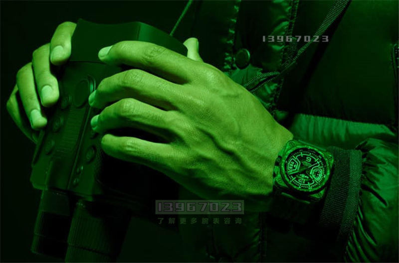 ▲采三明治式表壳设计,外层Lum-Camo夜光碳纤维,中层黑色DLC微喷砂二级钛金属,坚固且科技感十足。