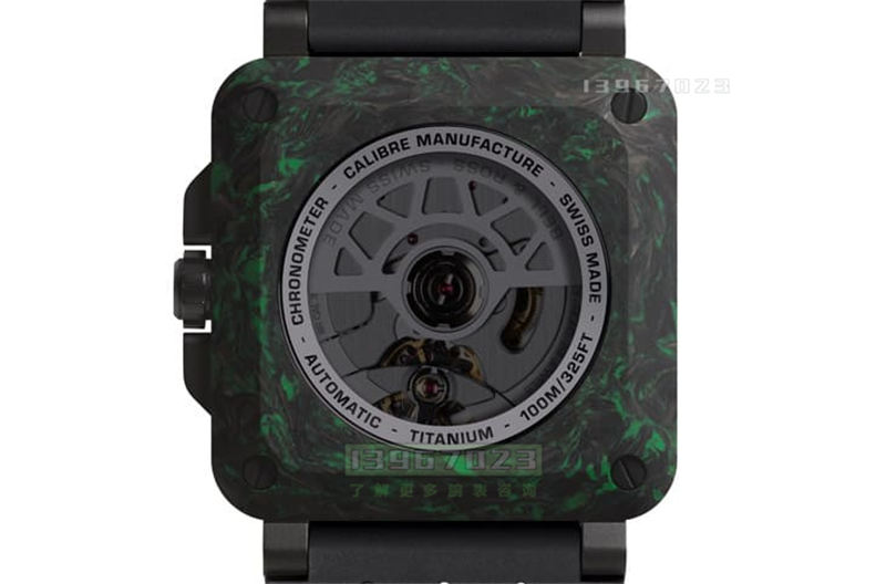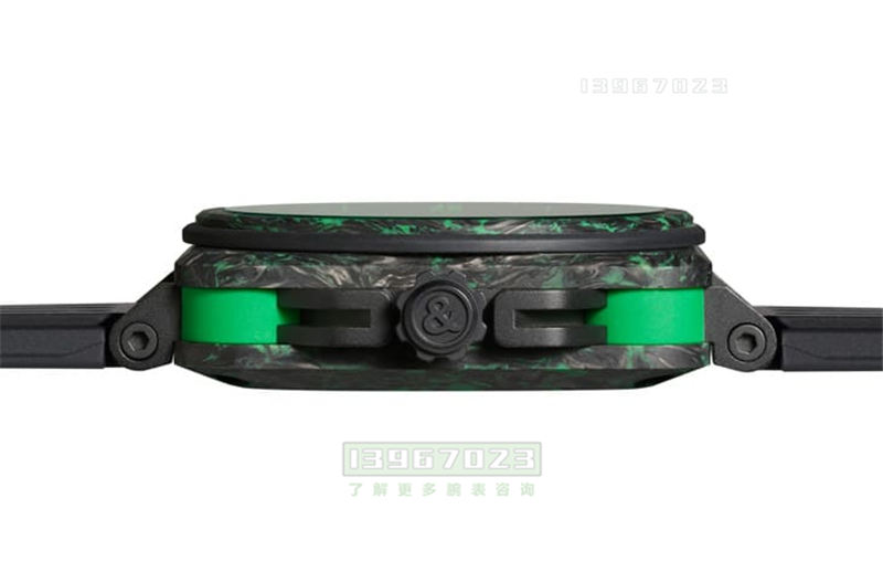 ▲多层X形镂空面盘覆盖绿色Super-LumiNova X2夜光,搭配绿色透明蓝宝石呈现立体科幻视觉效果。