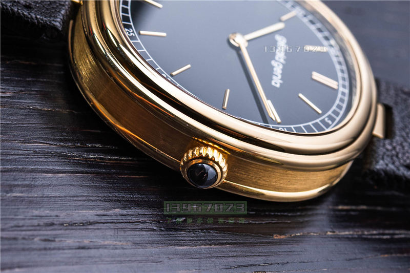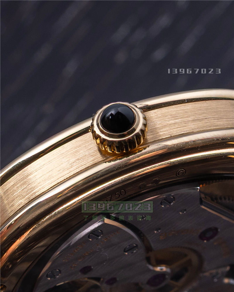 拉丝和抛光表面巧妙地相互映衬,强调了干净的线条和柔和的曲线,而表圈周围的一对圆点则让人想起经典的 Genta 细节。另一个让人想起最受欢迎的 Genta 标志的是单表耳设计,这不仅是这里最好看的选择,而且表耳的短小意味着这款手表适合各种手腕尺寸佩戴。从 Ariel 的手腕照片中可以看出,表壳纤薄、紧凑,没有任何不必要的笨重感。三问报时扳机在表壳左侧略微突出,而在另一侧,表冠上的黑色缟玛瑙凸圆形宝石为表盘增添了小而独特的视觉联系。