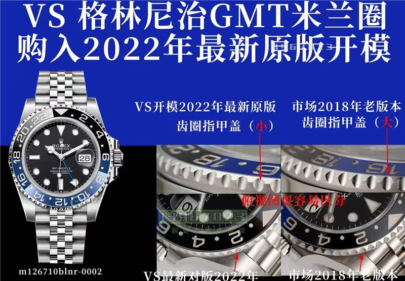但是我们要去看细节的话,是很多地方做的会更加的好。这里窗口它是两倍放大,其他厂的话它是三倍放大。然后它里面的四个角的话是这种小圆角,它并不是这种尖尖的,然后其他厂的话它是这种大圆角,它这个小圆角因为年份不一样,它这个是新款年份的,就是20年年份的那一个表款,就是比较新款的。然后这个六点钟,它这个调钉的话,四个角它都是有做这种圆形的,它并不是那种尖尖的,有做出来这种圆形的一个形状。然后防伪标也是看的比较清楚的,很多人说看不到标防伪标,我们可以斜着看,然后拿手电筒去照它就会比较明显了。就六点钟这个防伪标,然后玻璃的话也是有做凸起,它这个玻璃是有做倒角的,并不是切割的。它摸上去的话它是比较顺滑的,不会说很割手。