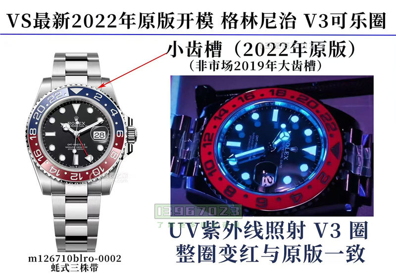 然后外圈的话,最主要它的外圈,目前市场上所有的工厂,它的外圈都没有像VS做的这么的紧。我们摇晃的时候,它是不会跟着转动的,它是没有那个间隙的。然后其他厂包括C厂,你转的时候它有一点点的间隙,就比如这样子轻轻的撞它就有这个间隙,然后VS它是没有这个间隙的,然后它这一个的话是雪碧圈,雪碧圈它这个外圈的话颜色的话,我觉得也是调的比较棒的。像C,它的外圈的话,它会比较鲜鲜红鲜艳一点。然后这一个的话它会比较暗一点,就雪碧谦这一个它会比较暗沉一点的一个颜色,看上去的话还是比较舒服一点的。