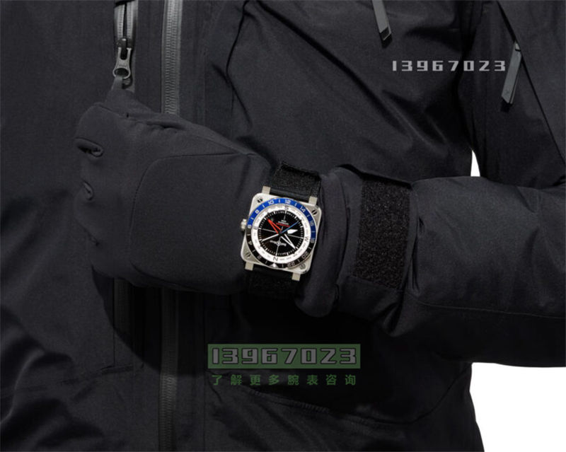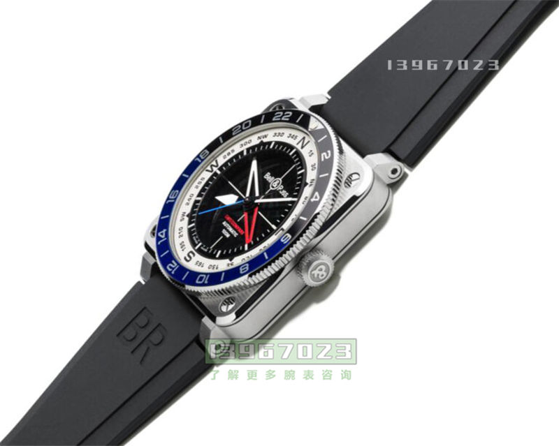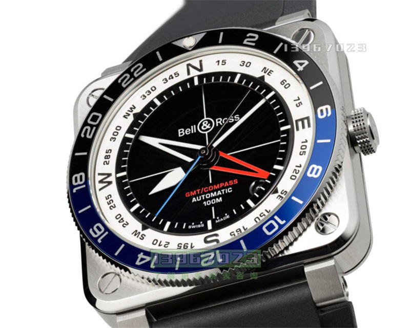 Bell & Ross BR-03 GMT Compass腕表(型号:BR0393-COM-ST/SRB)采用拉丝和抛光精钢打造,表壳沿袭了品牌标志性的BR-03系列方形轮廓,但尺寸略大于现有的日期显示表款,直径42毫米,厚度12.3毫米。此外,Bell & Ross还为BR-03 GMT Compass腕表配备了两条不同的表带,均采用螺丝固定方式(而非传统的弹簧杆)连接至表耳。第一条是黑色橡胶表带,搭配品牌标志性的针扣;第二条是黑色织物表带,采用魔术贴/钩环系统固定在手腕内侧。