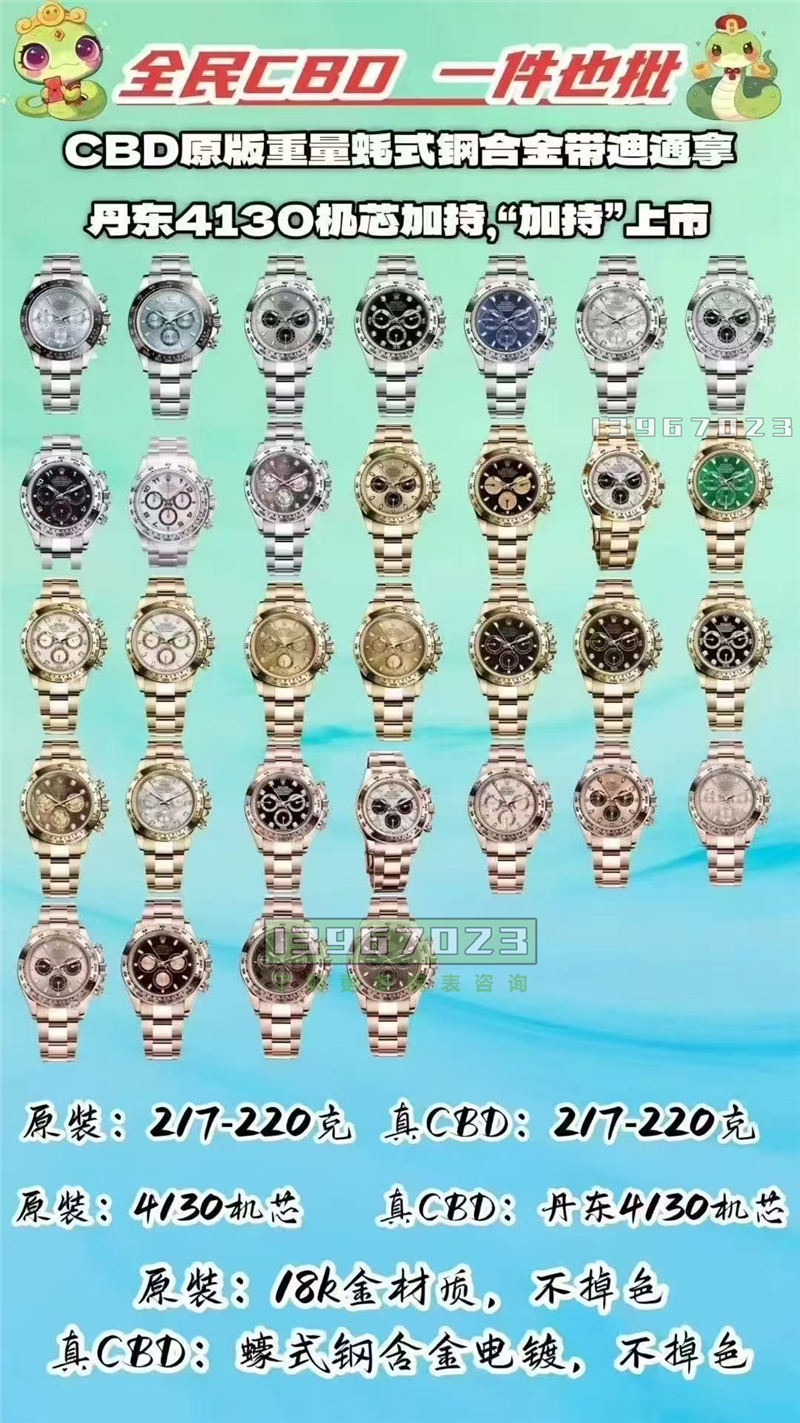 大家好,我是YD小编,今天说一下间金配重迪通拿,目前市面上其实劳的间金款又做了配重的表款是不多的。唯一就一家RC的间金黑间金蓝的水鬼,然后现在他也出了41的水鬼,就是说他现在涵盖了40、41的间金黑间金蓝。然后其他的话以前C+有做,它主要是增加表节什么的,所以说现在市面上能选到的间金款的迪通拿,目前CBD算是独一家,他也是做的比较好的。(朋友圈:13967023)