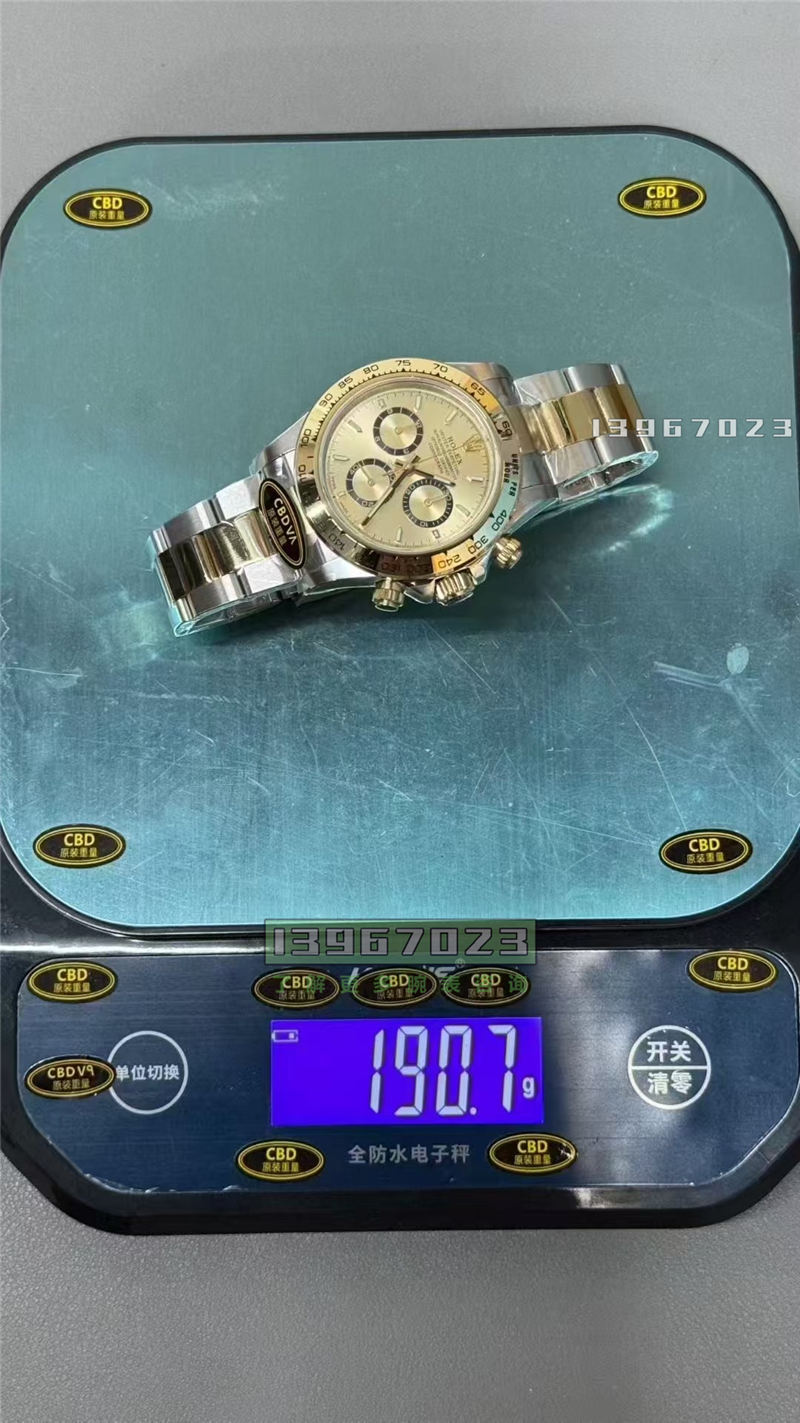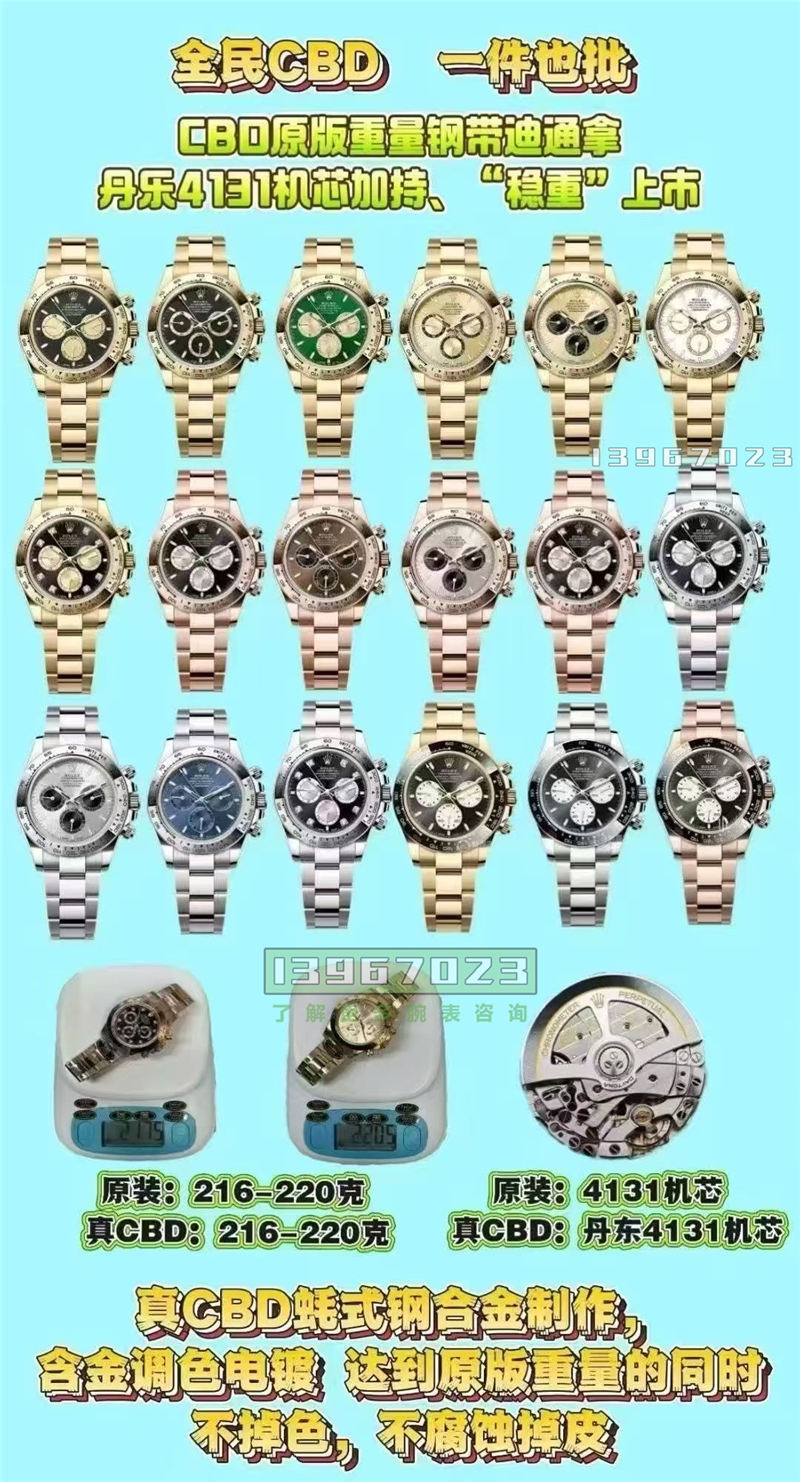 这款的重量是190。那么重量是对的所谓重量不对,一切都白费,也就是说你带出去装X,假设你的表拆下来,被人掂量一下,那最起码重量也一定是对的。然后抛开这个重量不说,那CBD的做工也是蛮不错他早期的品控是一般般,那现在的品控都是已经上来了,绝对没有说什么等一下盘又歪了,或者是机芯又不走,或者偷停什么的问题。因为他现在4131全都是用一个丹东的4131这个机芯,大家不用去说,然后剩下的就套壳。表壳的话没有什么技术含量,现在市面上所有的圈盘针,还有这些东西几乎都是同一家代工厂去那个的,所以说就没有什么在这些细节上的一个同质化。唯一的区别就是CBD厂的这个好适合金外加这个所谓的特殊金属去搭配的一个配重的版本。