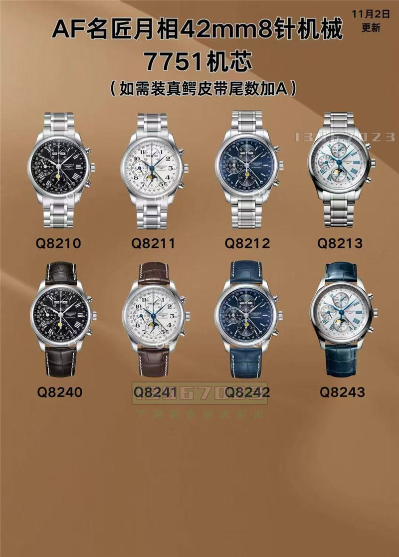 今天还是来跟大家聊一下八针月相这块表,这块八针月相是AFC 的,在评测这块表之前,我必须要说一个点,那就是八针月相的7751机芯返修率是非常的高的。之前我拍KL厂的时候就有提到过,KL厂调教的机芯返修率明显比GS厂要低很多。但是就算再低,返修率也有30%以上,而且实际的返修率肯定比这个更高,因为有一些副歌们可能表坏了就直接扔了,压根就没想过要修KL厂为什么要停产八针月相,也是因为返修率太高了,没办法维持利润。所以大家如果不是非常喜欢这块表,那就不需要考虑了。当然原版以前的ETA7751机芯版本返修率也是很高的,不过现在新版导柱轮机芯就会好很多而已。玩具版本的八针月相目前没有工厂开模新版的导柱轮机芯。