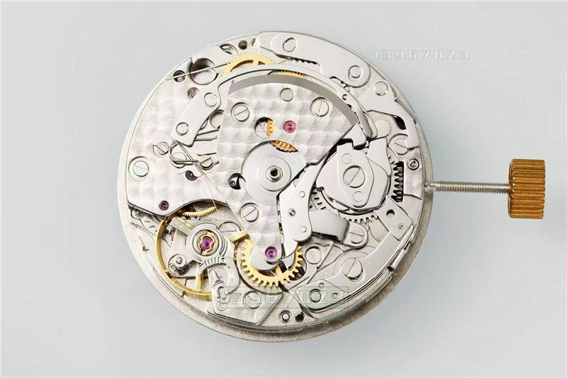 那么AF厂这款八针月相除了机芯,其他做工整表金属部分都是316L精钢,蓝宝石镜面材质和原版是一样的,指针都是烤蓝钢针,再加上整个多功能表盘的布局,确实有些好看。盘面的细节没什么槽点的,月相盘还是经不起放大看,这是所有带月相的玩具比较通病,肯定做不到和原版一样精细。左边小表盘两根针分别是秒针和24小时指针上下两个小表盘还有大秒针则是计时功能指针上方小表盘带有星期和月份显示,下方的小表盘则集合了月相功能。这块表我是强烈不建议开计时功能的,因为真的非常容易造成机芯损坏。当然计时功能也是可以用的,所有的功能都是和原版对版的。还有一点,调表的时候一定要避开跳力禁区。