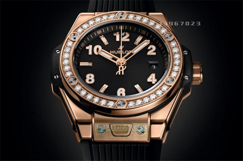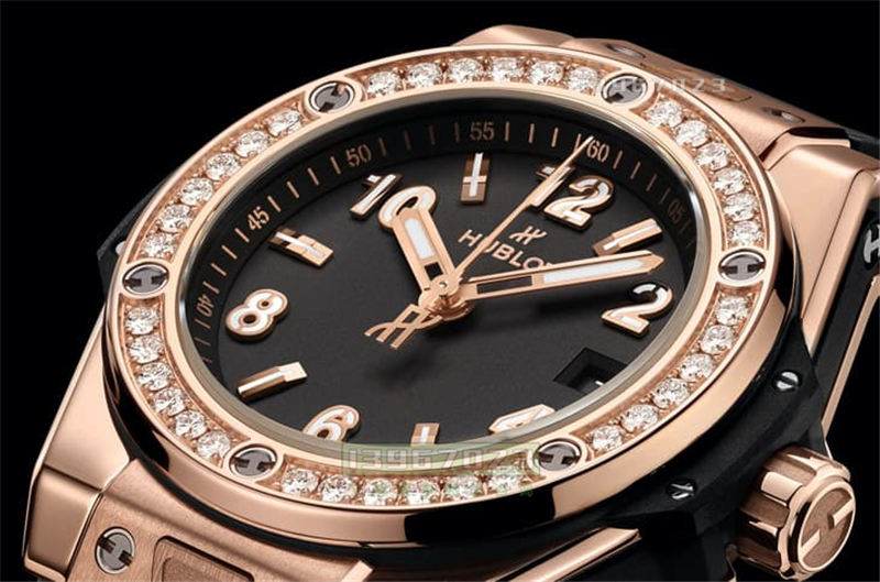 首先看到为女性打造的Big Bang One Click皇金钻表,采用33mm表径,佩戴起来比例轻盈且容易搭配,虽然是小尺寸手表,但整体魅力来自于光影与材质的组合,皇金表壳光泽柔润,表圈镶嵌36颗钻石,亮度干净利落,不会过于张扬,也不会被面盘的雾黑色压过去。