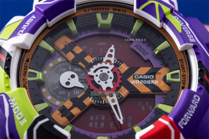 作为一款特别版腕表,卡西欧G-Shock GA110EVA307A并非严格限量编号生产,但其产量自然有限,并且很可能在2025年(《新世纪福音战士》30周年纪念,该动画于1995年首播)之后停止生产。2010年,卡西欧曾推出过类似的特别版腕表,以纪念《新世纪福音战士》15周年。那两款腕表也很酷,但相比之下,外观设计略显低调。值得一提的是,2010年和2025年推出的卡西欧G-Shock EVANGELION腕表均基于同一款核心卡西欧表款:G-Shock GA-110。GA-110是一款入门级G-Shock腕表,凭借其引人注目的设计、清晰易读的指针/数字双显表盘以及亲民的价格而广受欢迎。话虽如此,GA110EVA307A腕表的价格比普通GA-110腕表贵得多(几乎是两倍)。GA-110并非新款,非特别版的零售价在130至145美元之间。而为纪念《新世纪福音战士》30周年推出的G-Shock GA-110腕表,尽管采用了相同的硬件和电子元件,售价却接近300美元。粉丝们或许并不太在意。因为近来的经验表明,爱好者们(尽管这些色彩鲜艳的腕表在美学上褒贬不一)愿意为这种个性十足的G-Shock设计支付溢价。