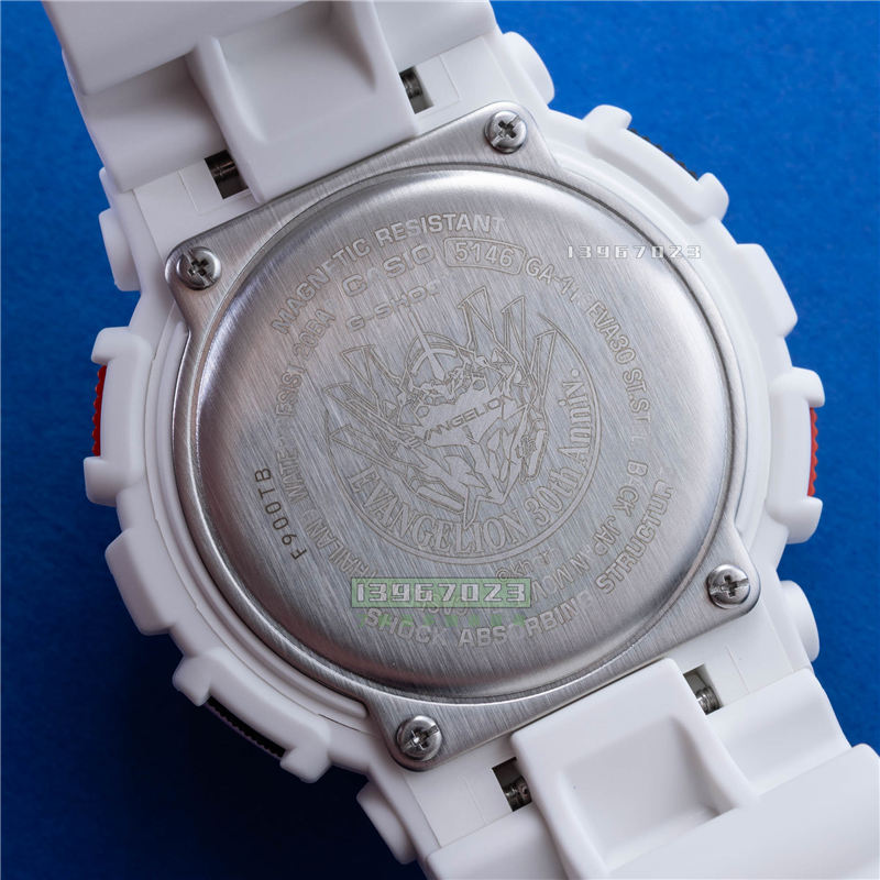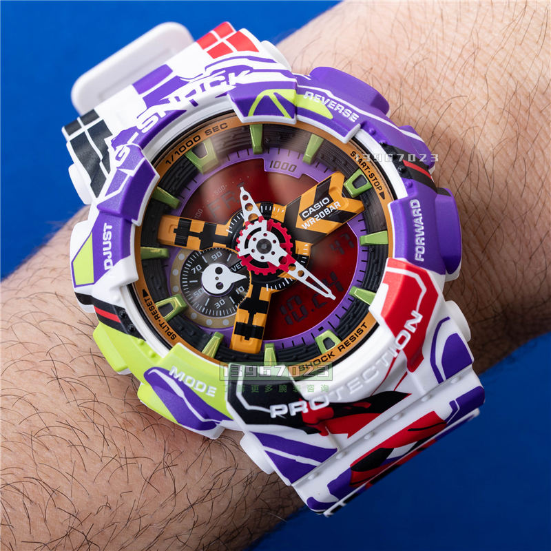 从概念上讲,GA110EVA307A 的设计融合了之前几款限量版 EVANGELION GA-110 腕表的元素。腕表的紫色、黑色、红色和绿色分别代表了《新世纪福音战士》故事中两大敌对阵营的主色调。这其中也包括 EVA 初号机,它是一种由人类驾驶的有机体机器人混合体。从根本上讲,《新世纪福音战士》的故事遵循着许多其他动画作品的模式。故事中,世界(主要是日本)受到巨型超自然怪物的威胁。这些怪物一心只想毁灭,而重建后的东京往往不幸成为它们肆虐的受害者。为了对抗这些怪物,人类驾驶着大型机器人或机甲,与它们进行一对一的战斗,展开一场场似乎永无止境的激烈战斗。随着剧情的推进,这些动画战斗的紧张程度和壮观程度也随之不断升级。在这部动画系列中,怪物被称为“天使”,主角们必须与十几种不同的天使形态战斗。该动画的受欢迎程度与其说是剧情的现实意义,不如说是其出色的美术指导、创意十足的构思以及令人难忘的角色和机械装置。