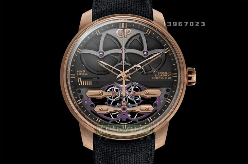 玫瑰金款也有不少外观细节值得一提,表壳采用全新的修饰组合,金属光泽在雾面与亮面之间转换,呈现强烈立体感。时标与表圈经细致打磨,镂空指针覆上夜光涂层,提升夜间辨读性,夹板上点缀金色标记,连GP标志也换上金色呈现,整体视觉统一而高雅,俨然是把机械技术包装成一件精致艺术品。