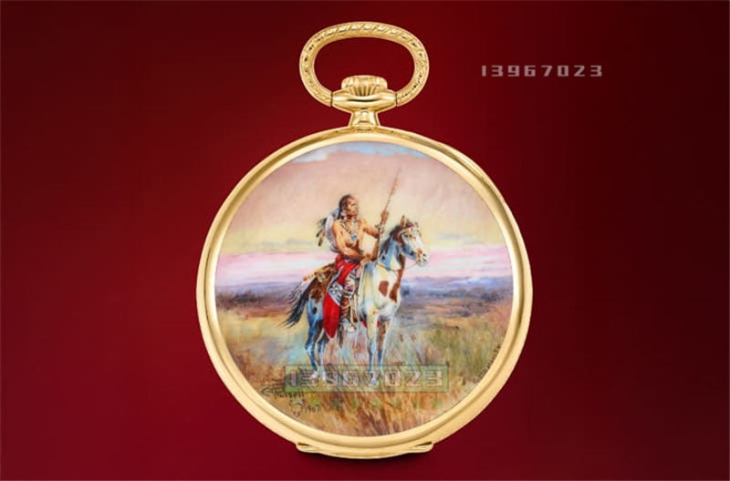 另外,百达翡丽也提供了足以撼动市场的重量级作品,有一款黄金材质、具有"Serpico y Laino"印字的手表被认为是目前已知仅存的一只,由于历史背景特殊,其黑色珐琅面盘搭配夜光时标与指针,完整呈现20世纪中期的经典工艺质感,估价为25万~45万美金(约合台币785万~1410万),反映出市场对稀有古董百达翡丽一向保持的高度信心。另一件值得留意的,是名为The Scout的百达翡丽怀表,由原藏家后代释出、并曾为1995年「百达翡丽传奇名表」展所准备,表壳上的微绘珐琅作品由大师G. Menni手绘,灵感源自CM Russell的1907年画作,是典型「艺术性与工艺价值并重」的作品,估价介于10万~20万美金(约合台币310万~630万)之间。