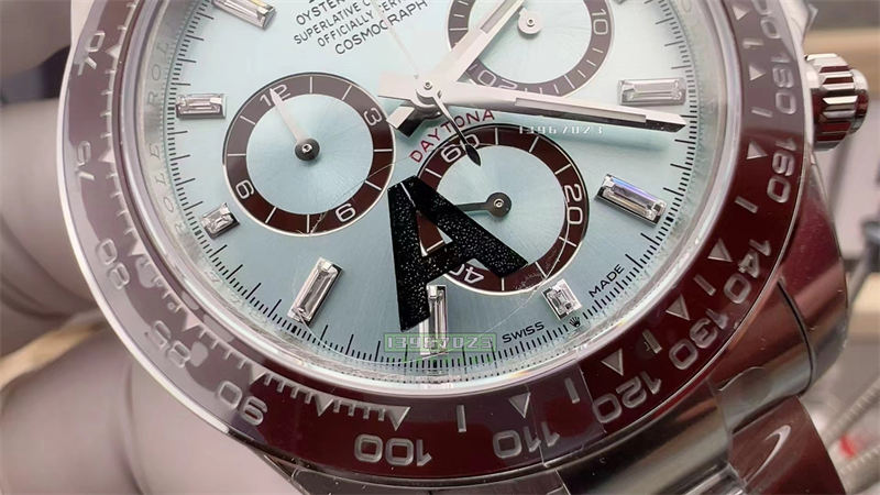 外圈是棕色的和原版是对版的,外圈刻度是铂金色的,填充细节方面还是挺不错的,现在这些外圈刻度基本上不会出现变黑的情况了,蓝宝石的镜面,镜面边缘也做了压边处理,盘面的颜色调的还是挺不错的,放射纹也很细腻,小表盘的纹路也是对版的,刻度是莫桑钻,原版则是真钻,虽然只是莫桑钻,我觉得火彩已经很不错了。指针打磨一如既往的好,不存在剪刀针的感觉,指针的厚度还是挺不错的,刻度已经是篆刻了,所以只有时针和分针有夜光填充而已。冰蓝色的夜光,夜光效果和夜光颜色都是对版的。
