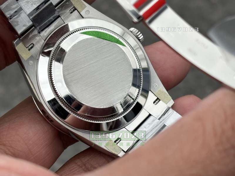 然后刚才说的它的表壳跟表带不加长不加厚,然后它的一个颜色也是相对比较正的,比较对版的。它这个颜色是有一点这种略微的微黄,就不是那种惨白色,因为白金的话它这个原装的都是有点这种微黄的感觉。它这个表壳也是做的比较对版的一个颜色,包括这些背面这些刻字AU750刻字都是比较深比较清晰的。微距看内影刻字细节都是相当不错的。圈口也是有做这个电镀白金的工艺,比较闪。