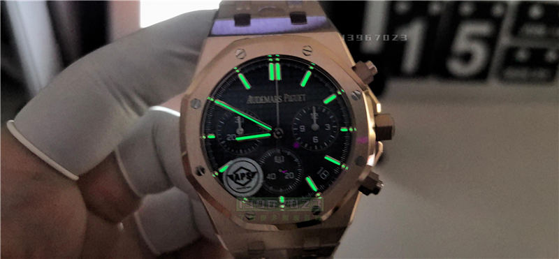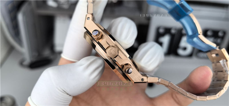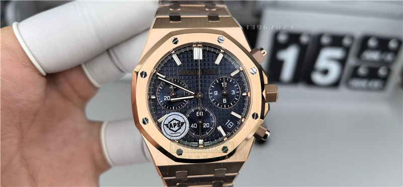 然后再来看一下整表的细节,然后在这个强光下APS这个字面做的还是非常细腻的。不管是这个小盘的一个方格纹路,还是它的一个小CD纹放射纹路,做的都是非常不错的。然后包括它的一些条钉、夜光填充,包括指针都是相当不错的。还有日历窗,日历字体也是对版的,然后包括它的一个玫瑰金的颜色,这个颜色现在调色也是非常正的一个颜色。表带拉丝的这种工艺,包括这个旁边的这种倒角很不错。里面该有的贵金属的打码是都有的。