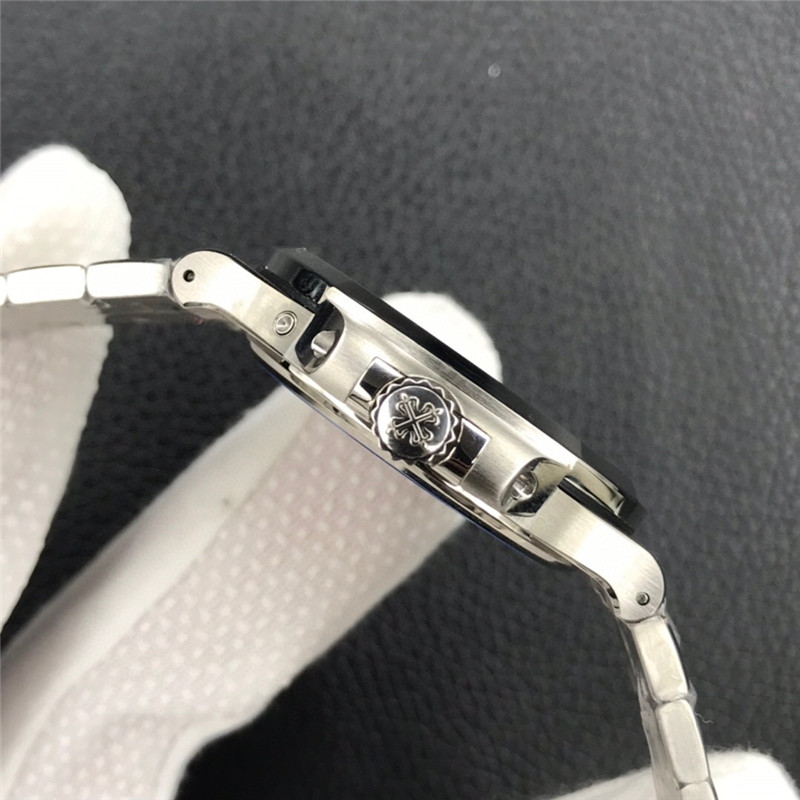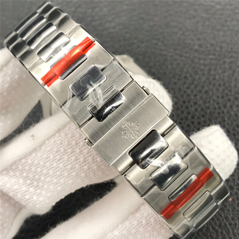 整体的一个厚度是一个8.58厚度,也是对版的一个厚度来的。再来看一下表带的一些细节。表带的话是一个拉丝打磨的工艺,然后中间的话是抛光的工艺。它最主要的是这个表带的升级的地方比较多。之前的话这个扣子的话是那种按压的一个扣子,现在的这个扣子的话是一个双开的一个蝴蝶扣。这个扣子的话目前的话升级了之后,是达到更对版的细节的。我们看里面的刻字,这刻字的话是一个真实的刻字来的,不是那个激光打印的那种,激光打印的那种。像其他工厂的话就是激光打印的,它就是不对版的。
