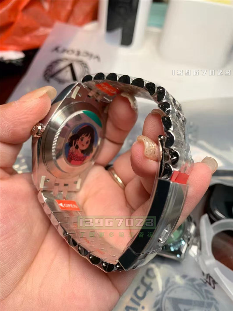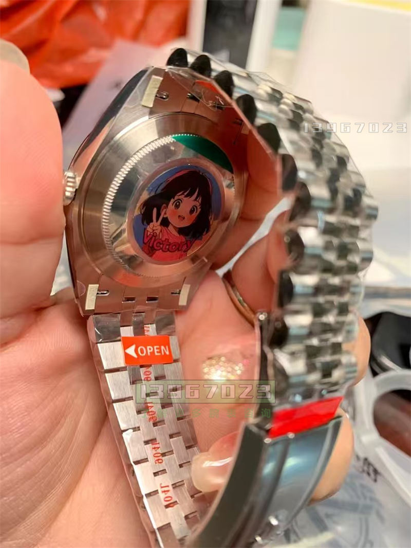 狗牙圈的话还是之前那个狗牙圈,904钢做了一层镀铂金的工艺的一个牙圈。表带的话还是那个表带,它只是那个扣子做了一个新版的平头A升级,再来看表带的一个细节,这个表带的细节还是跟之前一样,只不过是表扣做了一个小小的升级。这个感染标里面编码的编码还是之前一样的F6U的编码。包括这些感染标的话都是跟之前一样的,它只是扣子做了一个升级而已。包括这些细节各方面都是做的很完美的。这些倒角该倒角的地方都是做的很完美的,这些地方都是做的非常舒服的。