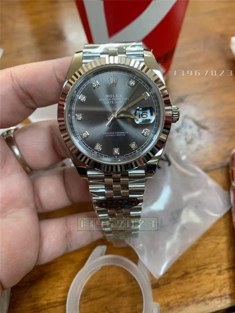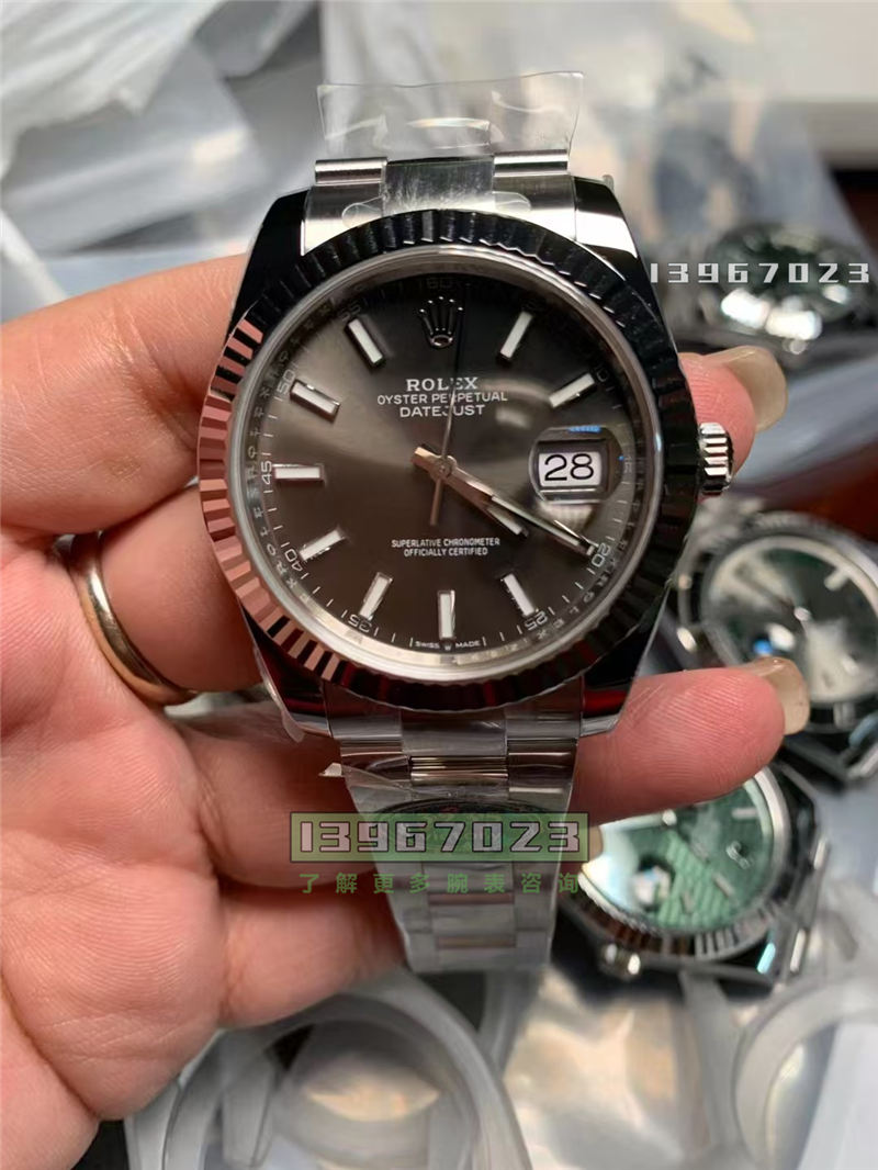 灰色的这个它的放射纹非常的细腻,拉丝的这个放射纹是非常的细腻的,包括它的条钉、夜光填充都是非常的均匀的,不会说渗漏出来。然后油性印刷斜着看它是非常的有立体感的。然后你戴久了,你不用担心它会褪色。因为目前日志出这么久,没从来没有出现过说这个印刷它会褪色还是怎么样,基本上是没有然后机芯的话,之前C的机芯不是都是用的上海的3235机芯,然后之后他又改成了丹东的了,他还没改成功之后,他就已经出事了,被被搞了。然后现在的话他又改名变成了V厂,然后机芯的话也全部都是升级到了丹东的3235机芯,包括36日志也全部都是改成了丹东的。