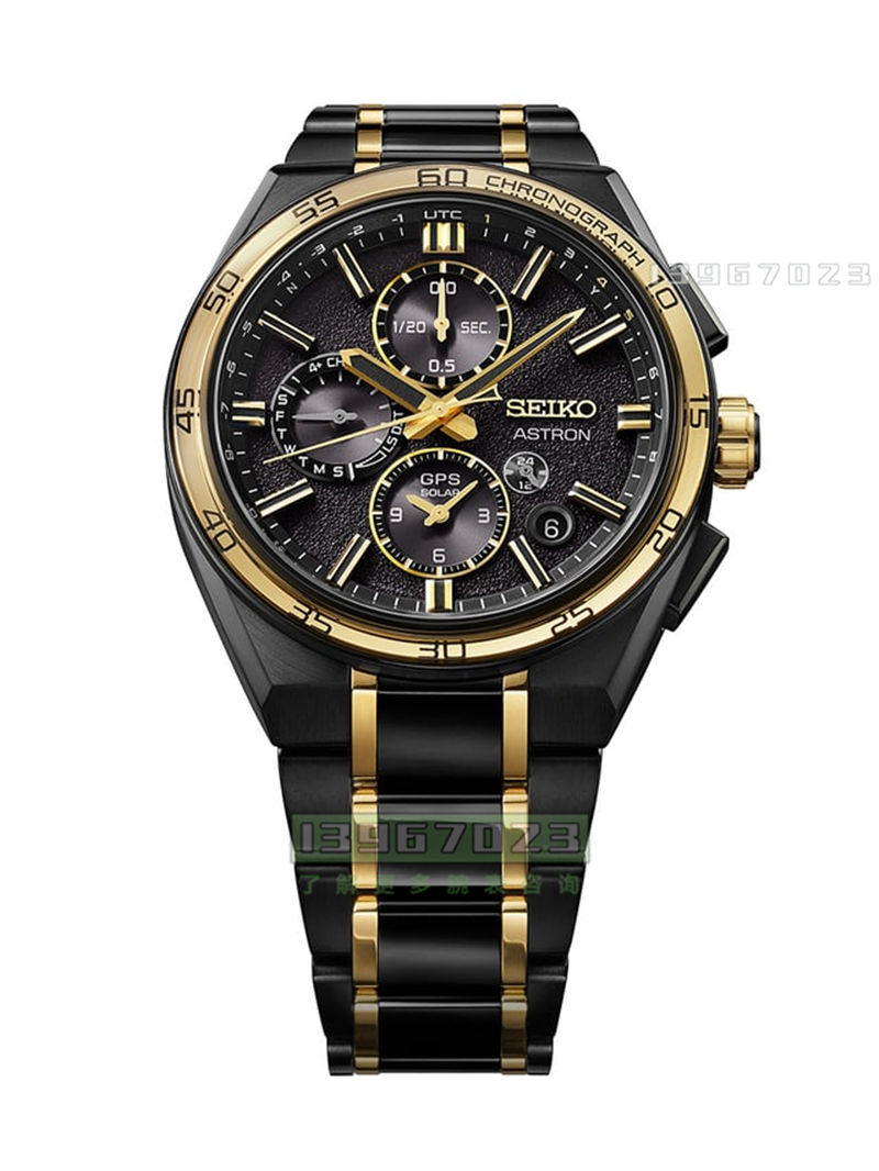 自1969年全球首款石英表——Astron石英表问世以来,Astron之名便成为创新的代名词。这款GPS太阳能双时区计时腕表延续了这一传统,表盘、表壳和表链均饰以金色元素,以此庆祝精工的周年纪念。表圈镶嵌金色蓝宝石水晶玻璃,更添深邃质感;UTC刻度上的金色标记则象征着品牌145周年庆典。这款腕表专为全球精准计时而设计,在光照条件下可自动连接GPS卫星网络,每日最多连接两次;也可一键手动同步。腕表搭载GPS太阳能机芯5X83,具备GPS控制的时间和时区调整功能、带AM/PM指示的双时区显示,以及在计时模式下,12点钟位置设有1/20秒计时盘,6点钟位置设有12小时计时盘。其他功能包括精准至2100年的万年历、自动夏令时调整、38个时区的世界时间以及省电功能。在未接收GPS信号的情况下,每月误差仅为±15秒。钛金属表壳和表链均采用黑色超硬涂层。表壳直径44.1毫米,厚度14.4毫米,防水深度达10巴,防磁性能为4800 A/m。