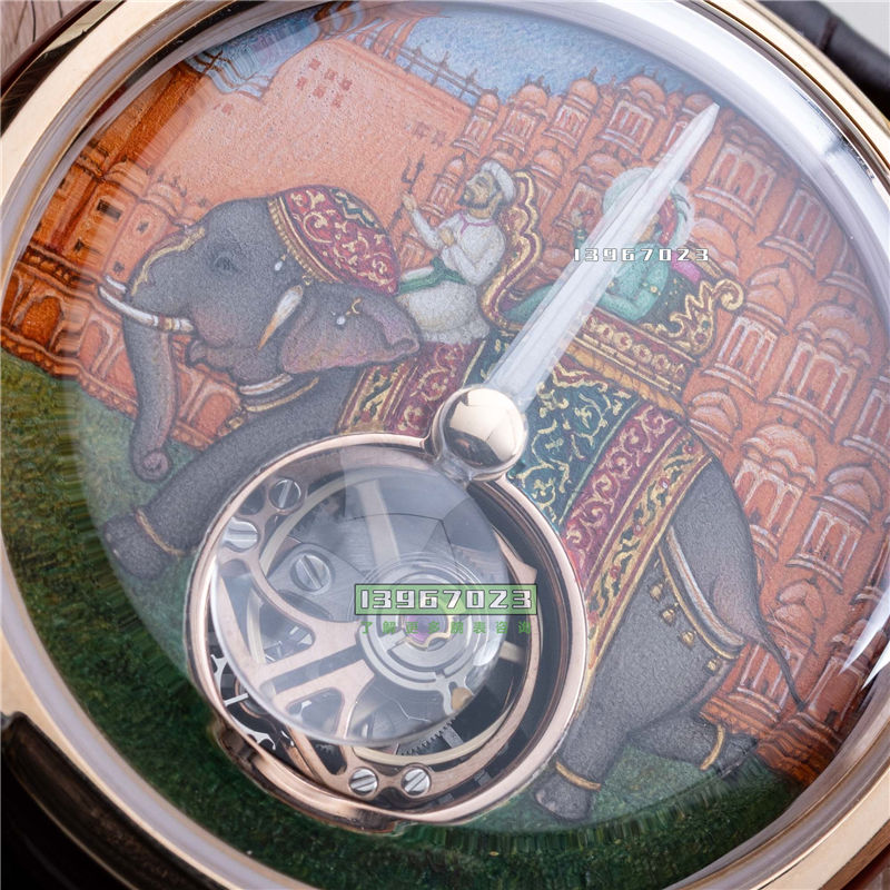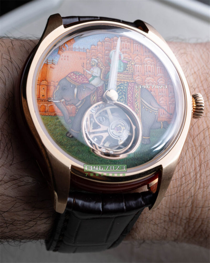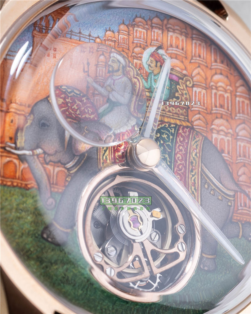 泰坦星云系列腕表特意致敬其手绘表盘背后的艺术家——帕德玛·什里奖获得者沙基尔·阿里先生。他是一位享誉盛名的印度历史场景及技法再现专家。Jalsa腕表的表盘以一块完整的大理石为画布,这块大理石便是他的调色板。每一枚表盘都需要数百小时的手工绘制,而他使用的画笔通常是由一根根毛发组成。这款腕表的表盘描绘的是萨瓦伊·辛格大君途经风之宫的场景。虽然与欧洲的细密画技法有所不同,但Jalsa表盘上描绘的大君骑在皇家象背上的画面却无可挑剔,细节丰富,色彩饱满,极具个性。