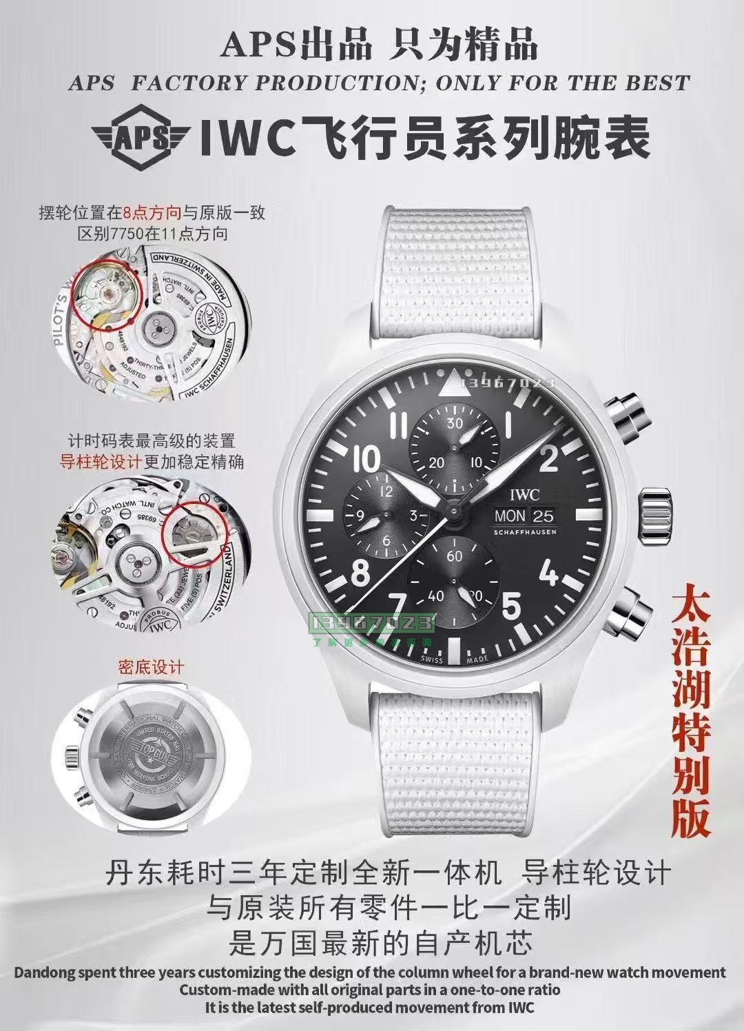 材质方面太浩湖的外壳是白陶瓷,但是并不是完全纯白的。这个色调也是还原了原版。指针是有黑色涂层的,所以不存在毛刺。盘面印刷都是没有什么问题的,盘面和指针的夜光填充都很均匀,日历字体也是对版的。如果硬要挑瑕疵,那就是指针中轴了。原版是实心中轴的,而APS厂则是空的,不过在正常社交距离下基本看不清这个地方。把头和计时按钮细节也是非常不错,底盖有套杆的刻字也是非常清晰的,搭配的是白色胶带,表扣是折叠扣,表带安装的位置也是对的。