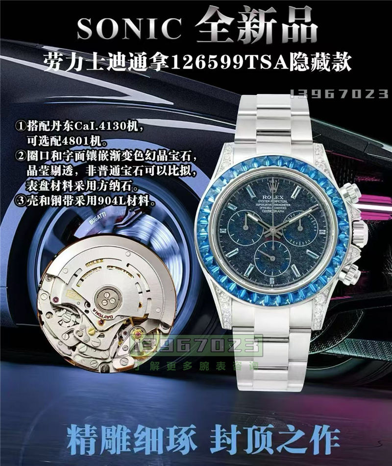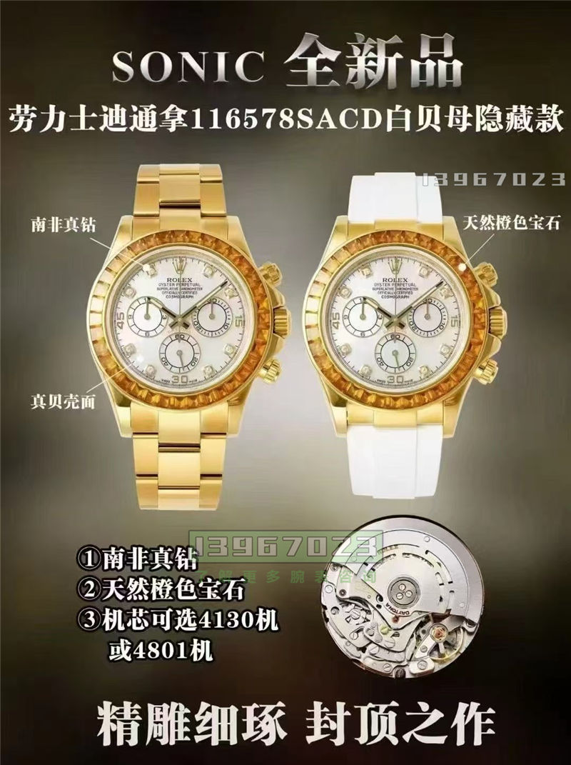 大家好,老店长来讲一下这种VIP隐藏款的迪通拿好吧。什么叫隐藏款?就是你在这个劳里面消费了到了一定的级别,然后达到一个VIP或者VVIP的一些程度,你才有资格去购买这个表。然后这个表价格也是不菲的那通常是数倍于一些普通管的。我们都知道像绿金迪可能六七十万、七八十万是吧,但是像这种镶钻的,然后是隐藏表款的特殊盘面材质的话,它的原版价格是几百个W的,堪比一些理查德的价格。就是你对这个老有一些情怀的话,那么你会喜欢这种表款的。当然了比较的奢华,就比较的土豪性质了。(朋友圈:13967023)