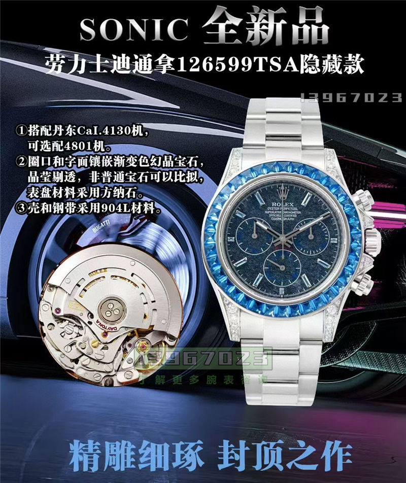 我们再来看一下细节,整表的这些钻都是用的莫桑石,原版则是真钻,毕竟几K的没办法和几百W的对比,成本就摆在这里。但是墨三十的火彩还是挺不错的,外圈的梯状也能看到纹路的细节。按照以前来说,如果要改装一块隐藏款的迪通,拿用上莫桑石的话,可以说比Sonic这个还要贵上两3K但是现在工厂直接就出了也给大家省了不少。