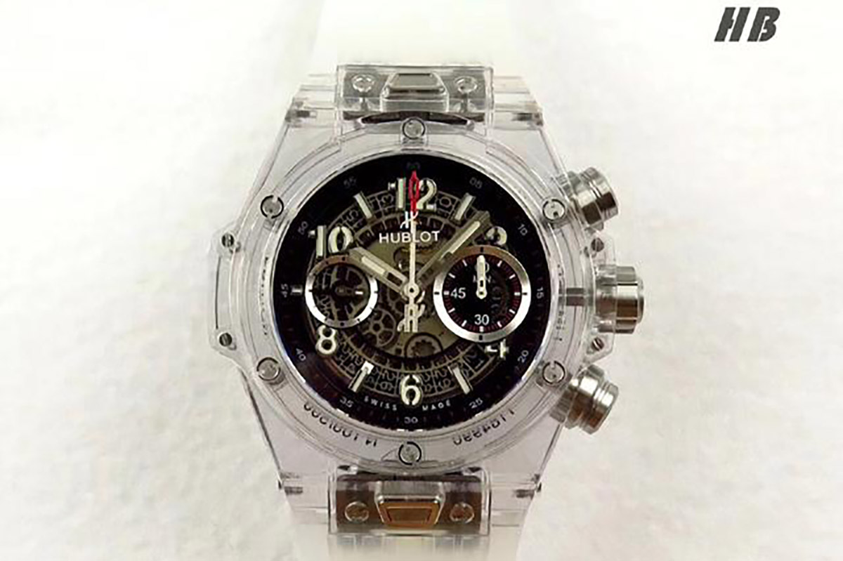 HB厂宇舶大爆炸系列透明壳复刻腕表选用丙烯酸有机玻璃制作透明清晰展现机械复杂机芯,透过一系列复杂高难度的制造进程提升了腕表自身的价值,全景透可清楚呈现每个细节。通体剔透的44毫米直径表壳下,其他机芯零件和表盘结构皆能够360度全方位视角调查,做工可谓十分出色!