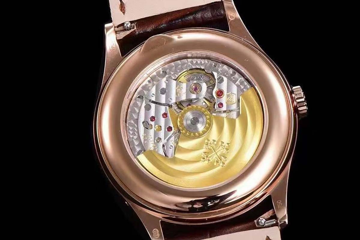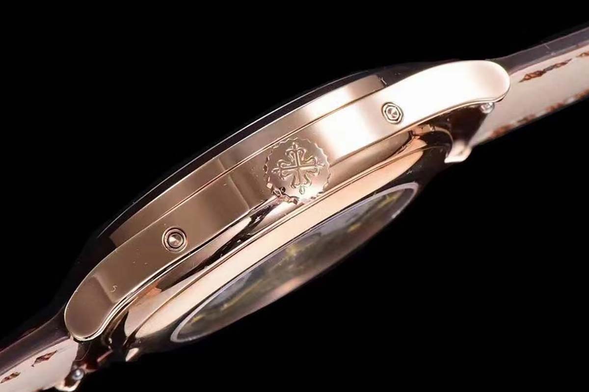 表GR厂百达翡丽5396R年历款式月相正装复刻腕表盘细节方面,盘面的刻度和指针,悉数通过贵金属PVD处理,复原百达翡丽5396休闲高雅的经典气质。表带选用手艺缝线意大利进口牛皮,纹理清晰,搭配百达翡丽经典灯笼扣,贴合性好,佩带舒适。